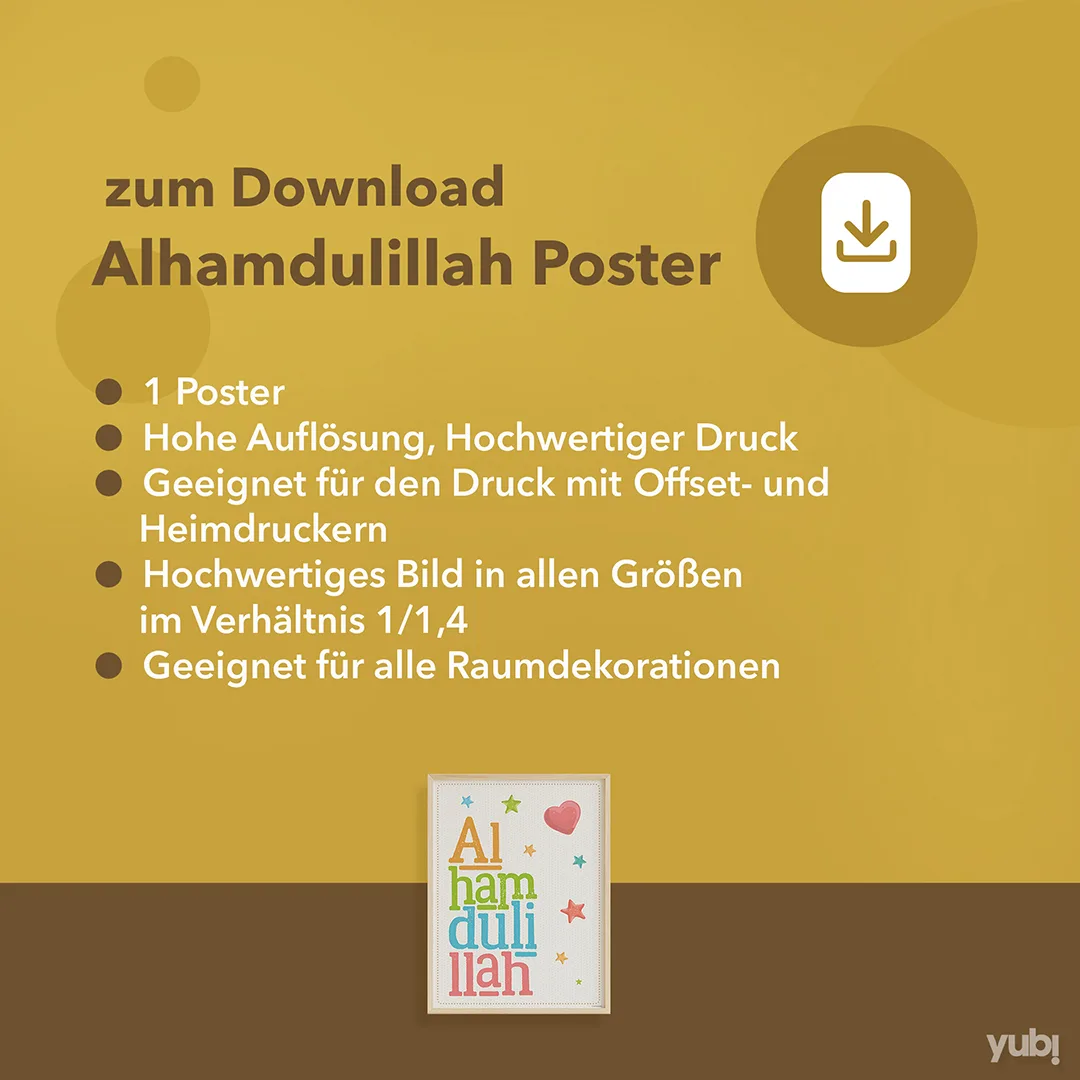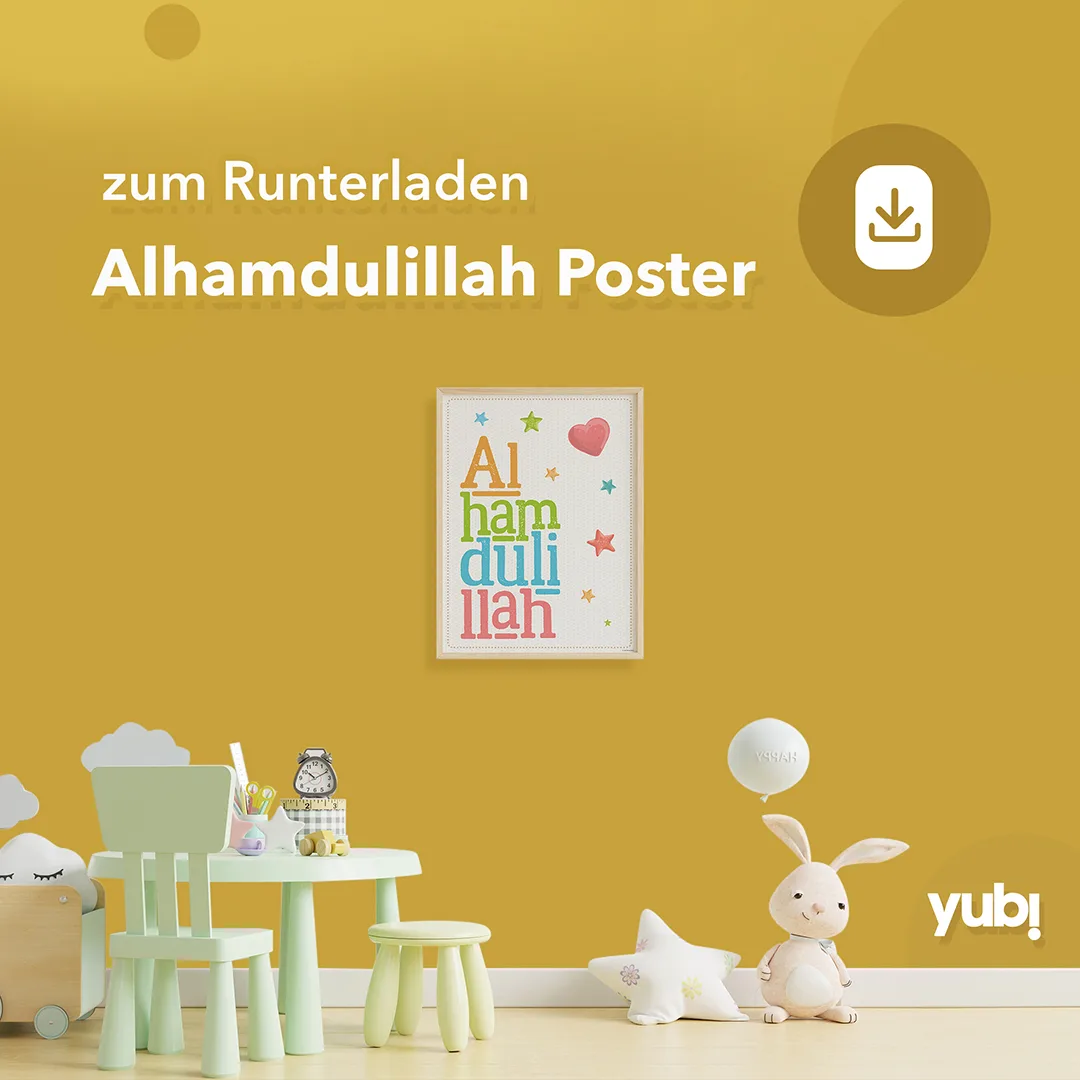 Entdecken Sie unsere „Alhamdulillah“ Wandposter im Yubi Onlineshop. Verfügbar als sofort nutzbare Download-Dateien, bieten sie eine einfache Möglichkeit, den Raum Ihres Kindes individuell zu gestalten und eine inspirierende Note hinzuzufügen. Stärken Sie den Glauben und das Selbstvertrauen Ihres Kindes mit unseren liebevoll gestalteten Postern, die täglich an die Bedeutung der Dankbarkeit erinnern.