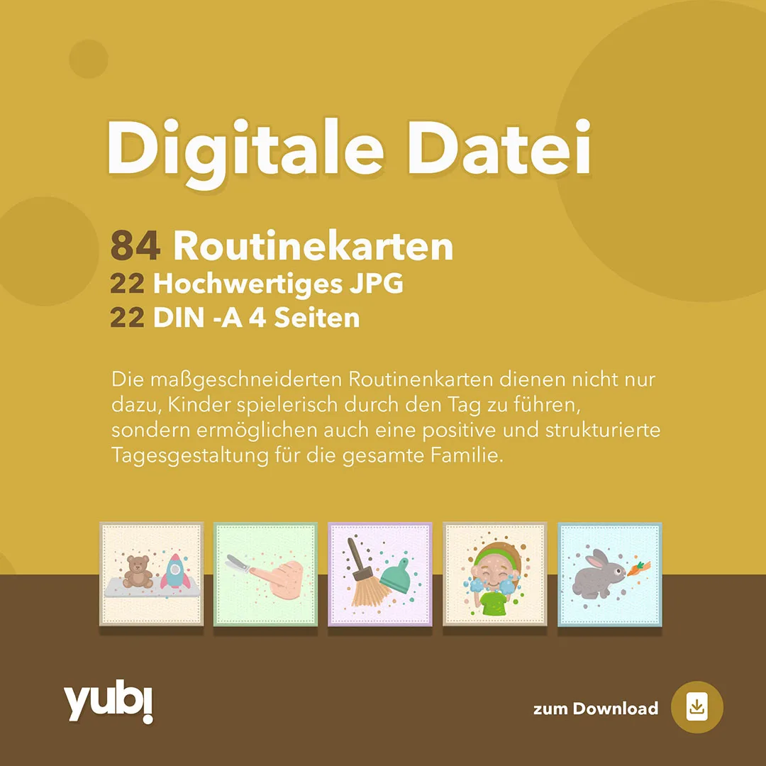 Mit liebevoll gestalteten Illustrationen und klaren Anweisungen sind unsere Routinekarten einfach zu verwenden und machen den Tagesablauf für Kinder zu einem unterhaltsamen Abenteuer. Von Zähneputzen bis hin zum Aufräumen des Zimmers – jedes Ritual wird spielerisch vermittelt und fördert gleichzeitig wichtige Fähigkeiten wie Verantwortung und Selbstständigkeit.